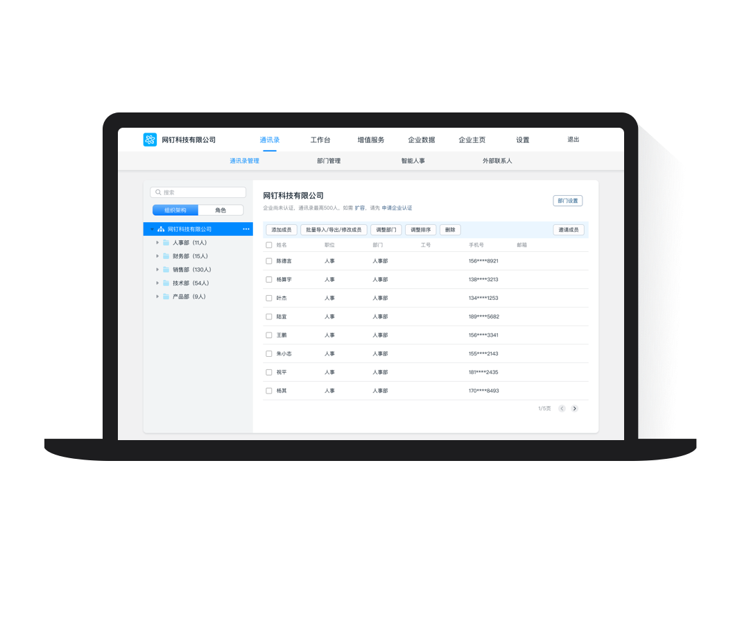 统一通讯录人员信息导入统一通讯录进行管理,支持手机添加/邀请员工,PC端批量导入员工。