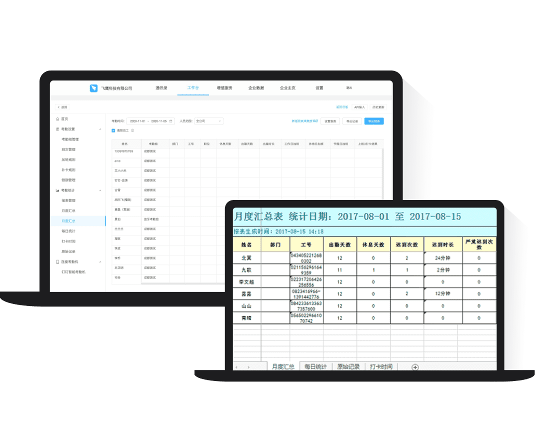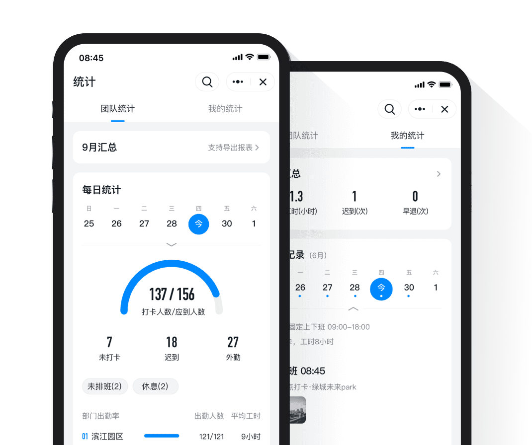 老板随时了解团队状态出差在外,通过手机统计,也能随时了解团队状态,迟到加班一目了然。
