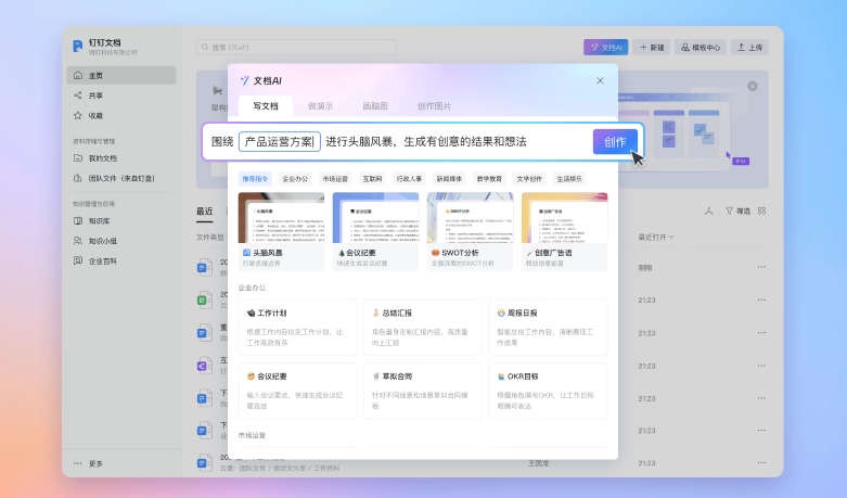 提供超过 50+ 创作指令,快速上手,一键轻松完成各种场景的文档内容创作。