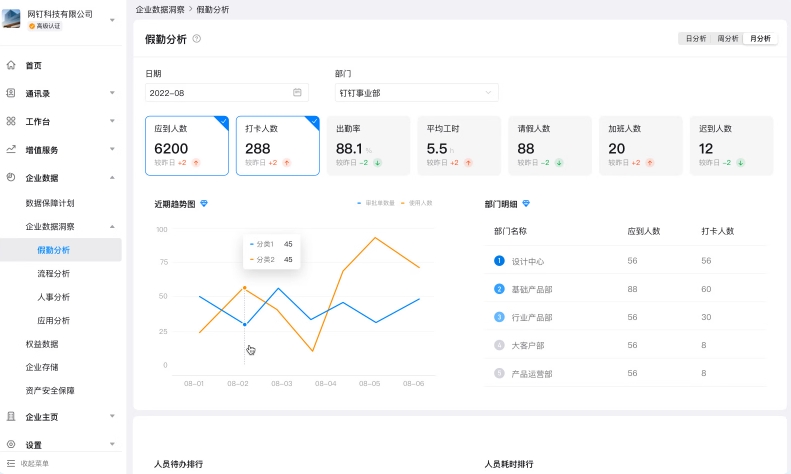 通过应到人数、打卡人数、出勤率、加班及迟到等假勤实时数据,全面了解出勤情况,帮助优化企业生产排班计划