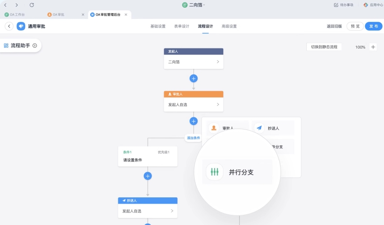通过并行节点、业务规则、动态流程、OCR识别、单选数据联动、多条件组合等能力支持企业90%以上的业务流程